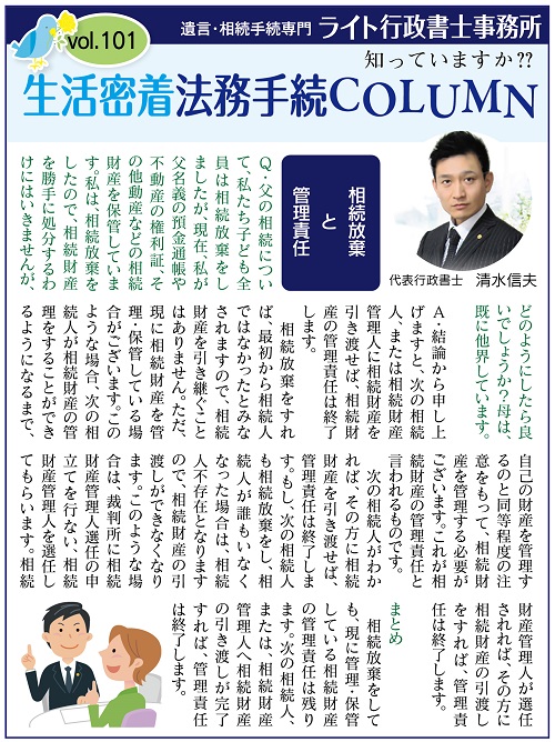 A 結論から申し上げますと、次の相続人、または相続財産管理人に相続財産を引き渡せば、相続財産の管理責任は終了します。