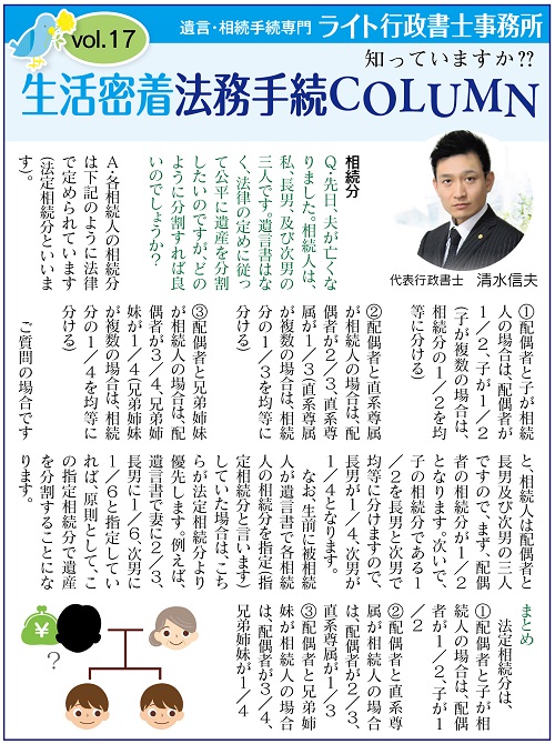 @配偶者と子が相続人の場合は、配偶者が1/2、子が1/2(子が複数の場合は、相続分の1/2を均等に分ける)