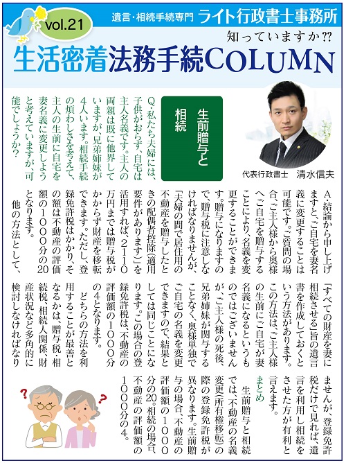 他の方法として、「すべての財産を妻に相続させる」旨の遺言書を作成しておくという方法があります。この方法は、ご主人様の生前にご自宅が妻名義になるというものではございませんが、ご主人様の死後、兄弟姉妹が関与することなく、奥様単独でご自宅の名義を変更できますので、結果としては同じことになります。この場合の登録免許税は、不動産の評価額の4/1000となります。