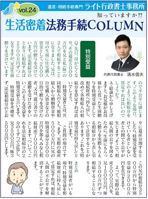 特別受益者とは、共同相続人のうち、被相続人から婚姻資金や自宅購入資金などの目的で贈与を受けた者、又は、遺言書での遺贈を受けた者をいい、このような受益を特別受益と言います。