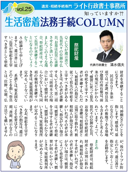 Q 亡父が遺言書で、先祖代々の位牌や仏具、お墓は、長男に承継させると書いてありました。このような場合、祭祀財産は、すべて長男が承継することになるのでしょうか?