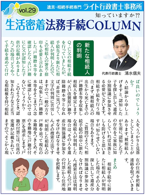 Q 亡父の相続手続を行っていましたが、手続先より新たに相続人が判明したので、この相続人の署名・捺印も必要と言われました。戸籍謄本等を確認したら、古い戸籍に亡父が認知した子供の記載がありました。この場合、どうやって手続を進めて行けば良いのでしょうか?