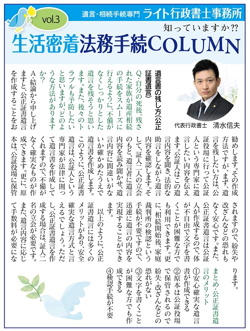 その作成方法ですが、まず、遺言を残したい方は、公証役場に行って公証人という専門家に遺言したい内容を伝えます。公証人はこの遺言内容を聞き、法的な助言をしながら遺言内容を確認します。そして、証人二人の立会のもと、遺言者に遺言内容を読み聞かせ、遺言内容に間違いがないか確かめたうえで遺言書を作成します。このように、公正証書遺言は、公証人という専門家が法律に則って遺言書を作成してくれますので、不備がなく確実なものが作成できます。更に、原本は、公証役場に保管されますので、紛失や改ざんなどの恐れもなく安心です。また、公正証書遺言は公証人が作成するので、体が不自由で文字を書くことが困難な方でも利用できます。更に、相続開始後、家庭裁判所の検認という手続が不要ですので、迅速に遺言の内容を実現することができます。