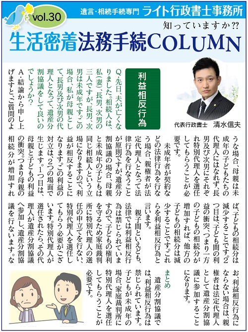 遺産分割協議では、利益相反行為は禁じられています。子供が未成年の場合、家庭裁判所に特別代理人を選任してもらうことが必要です。