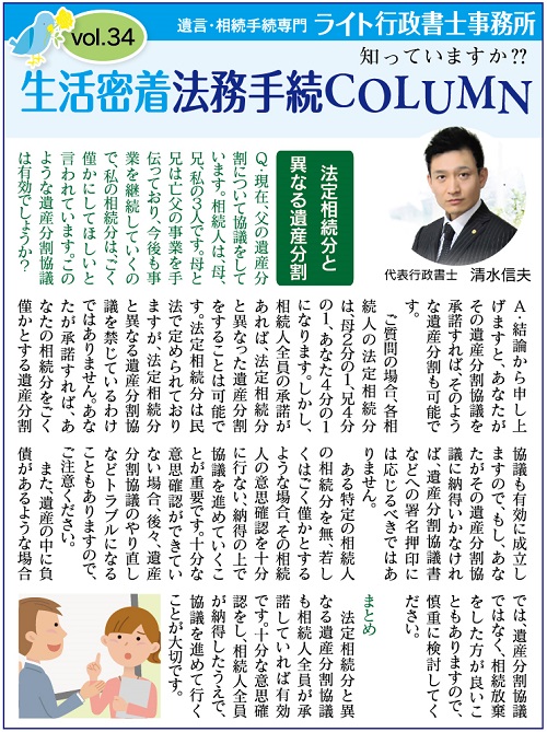 法定相続分と異なる遺産分割協議も相続人全員が承諾していれば有効です。十分な意思確認をし、相続人全員が納得したうえで、協議を進めて行くことが大切です。