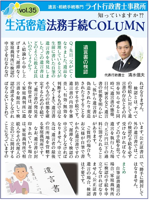 ご質問の場合も、お父様が自筆で書かれた遺言書ですので、遅滞なく検認の申立てをしなければなりません。申立て先は、遺言者の最後の住所地を管轄する家庭裁判所です。