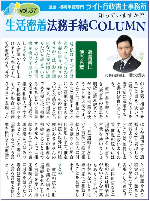 まず、推定相続人である妻には、「相続させる」という言葉を使用します。妻は、推定相続人ですので、相続権があります。この場合、「相続させる」と表現したほうが適切です。「遺贈する」と表現した場合よりもメリット(ここでは、割愛します)もございますので、推定相続人には「相続させる」と言う言葉を使いましょう。