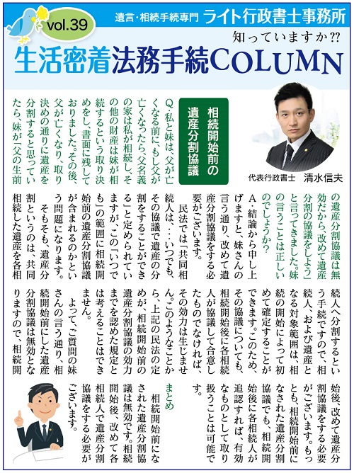 よって、ご質問の妹さんの言う通り、相続開始前にした遺産分割協議は無効となりますので、相続開始後、改めて遺産分割協議をする必要がございます。
