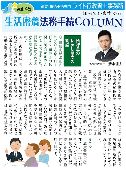 Q 相続法が改正され、2019年7月1日より、預貯金の払戻し制度が創設されると聞きました。具体的にはどのような制度なのでしょうか?