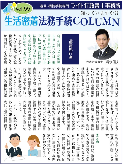 A まず初めに、あなたが遺言執行者に就職(就任)するかどうか判断し、その意思表示をしなければなりません。遺言書の中で遺言執行者に指定されているだけでは、その遺言の執行について何ら権限があるわけではなく、就職することに承諾し、意思表示することで初めて遺言執行者としての任務が開始することになります。意思表示は、すべての相続人及び受遺者に対して行います。