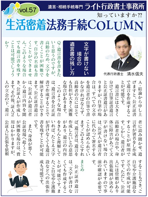 Q 遺言書を書きたいと思うのですが、高齢のため、文字を書くことが困難です。自分の名前も書くことができません。このような場合でも遺言書を残すことは可能でしょうか?