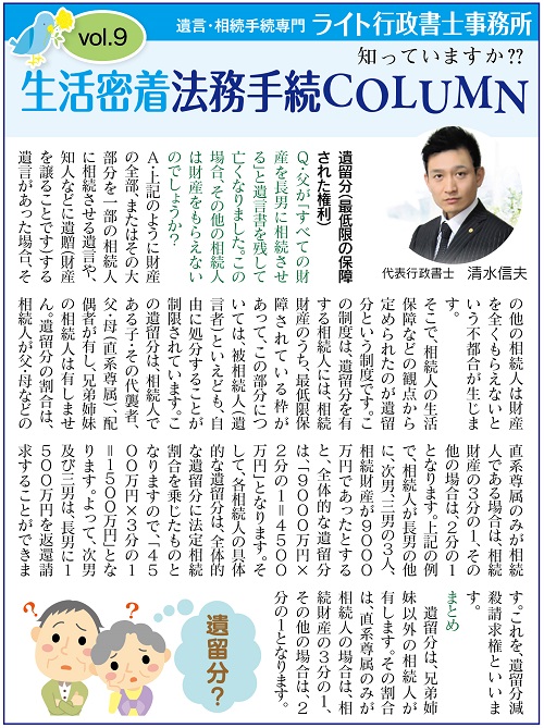 A 上記のように財産の全部、またはその大部分を一部の相続人に相続させる遺言や、知人などに遺贈(財産を譲ることです)する遺言があった場合、その他の相続人は財産を全くもらえないという不都合が生じます。