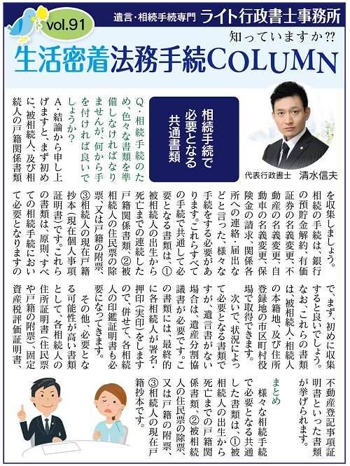 様々な相続手続で必要となる共通した書類は、@被相続人の出生から死亡までの戸籍関係書類、A被相続人の住民票の除票、又は戸籍の附票、B相続人の現在戸籍抄本です。
