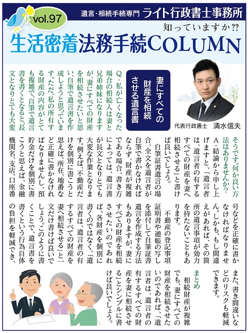 不動産の登記事項証明書や通帳の写しを添付して自筆証書遺言を作成する方法もありますが、妻にすべての財産を相続させたいのであれば、各財産を個別に書くのではなく、「遺言者は、遺言者の有するすべての財産を妻へ相続させる」と一文だけ書けば良いでしょう。このように書くことで、遺言書を書くという行為自体の負担を軽減でき、また、書き間違いなどのリスクも軽減できます。